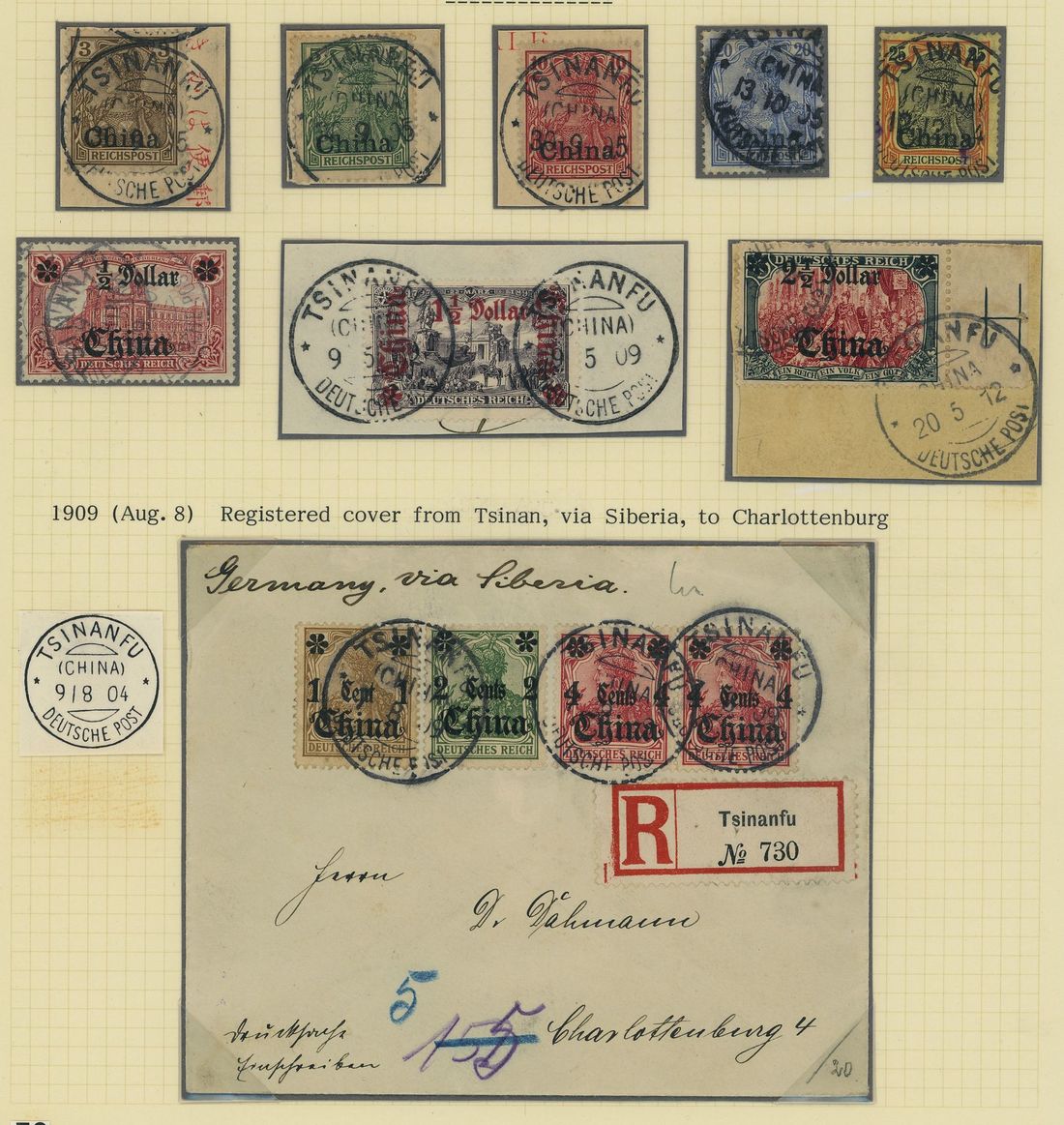 The selection with 1909 (8 Aug.) envelope registered to Charlottenburg showing a fine example of the registration label; also various single stamps and some pieces, including 1905 ½ dollar on 1m. variety left star on point and 1905-19 2½ dollar on 5m variety left star on point (Mi. 47A I ba; Chan FG54aii); all cancelled by the type 7B c.d.s. Ex Meiso Mizuhara