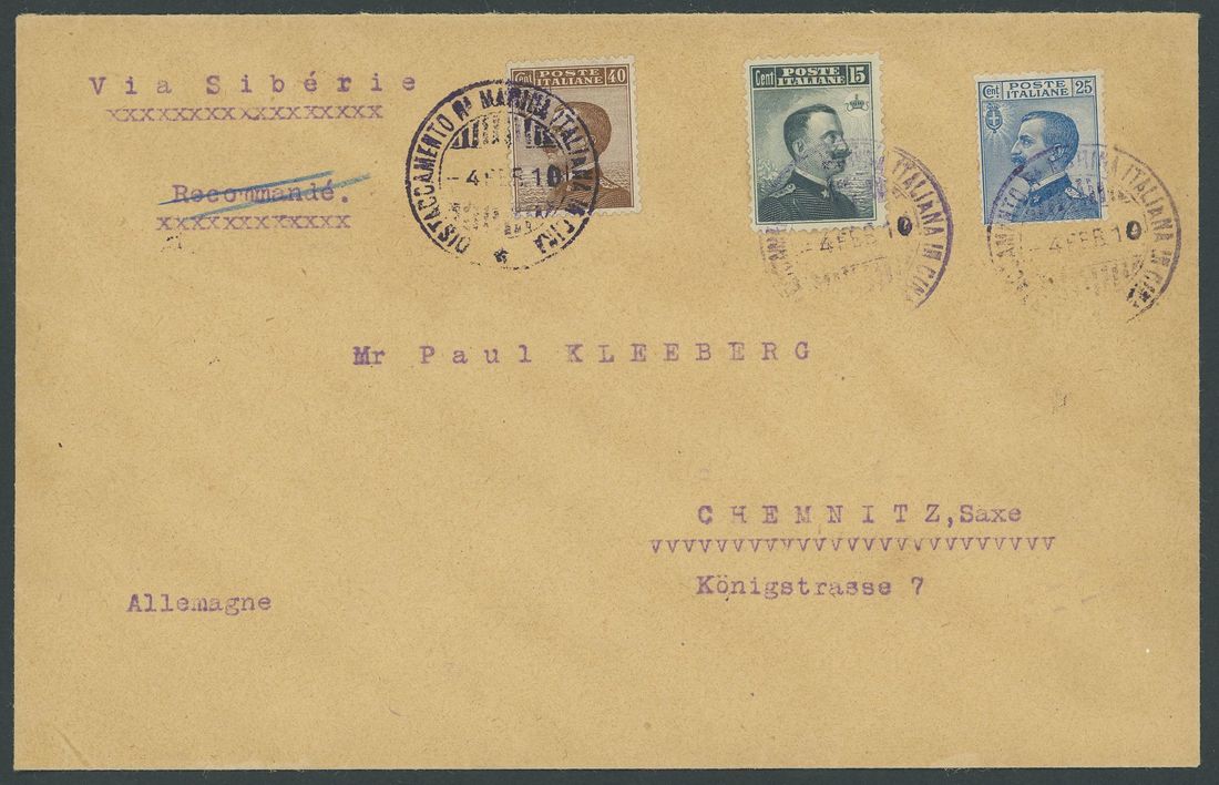 Marines Detachment: 1910 (4 Feb.) envelope to Germany "Via Siberie" bearing Emmanuel 15c., 25c. and 40c. tied by "