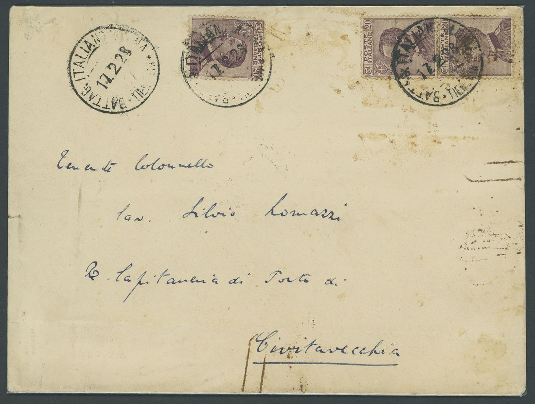 1928 (17 Feb.) envelope (part flap missing, soiling) sent from Tientsin to Civitavecchia bearing 1925-27 Michetti 20c. purple (3) tied by fair strikes of 28mm double-circle "