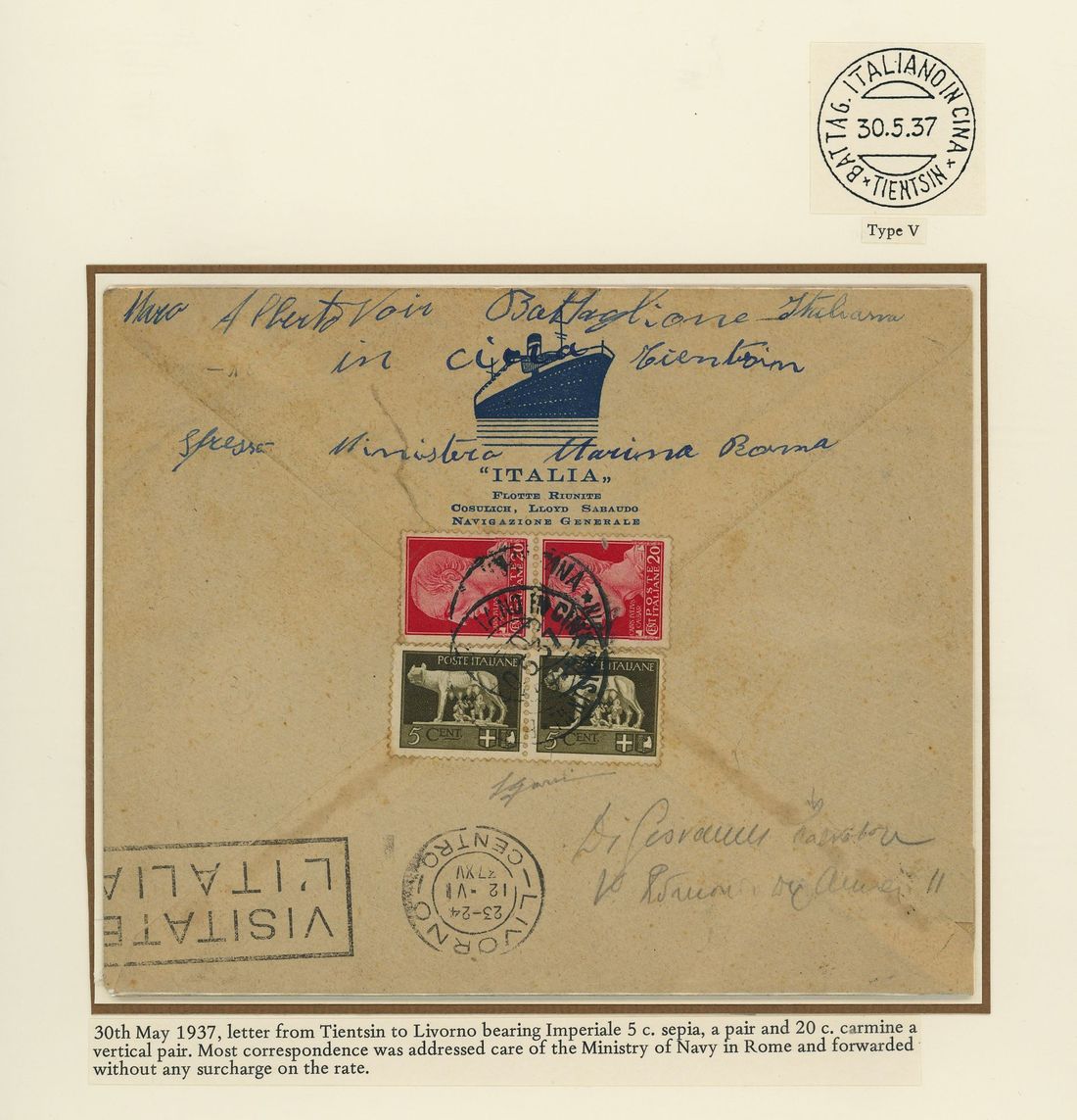 1937 (30 May) the steamship 'Italia' envelope with logo on flap, to Livorno bearing, on the reverse, Imperial series 5c. (2) and 20c. (2) cancelled by the double-circle