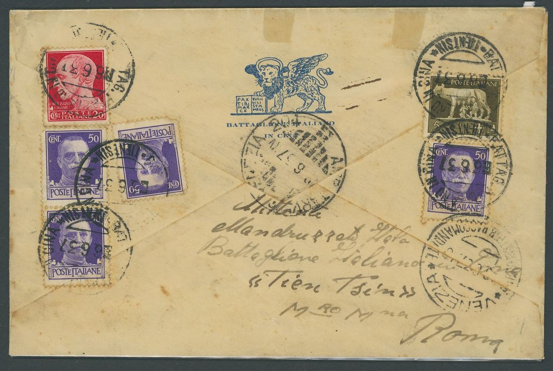 1937 (6 June) battalion envelope with device on flap, registered to Venice, via Rome, bearing, on the reverse, Imperial series 5c., 20c. and 50c. (4) cancelled by the double-ring "