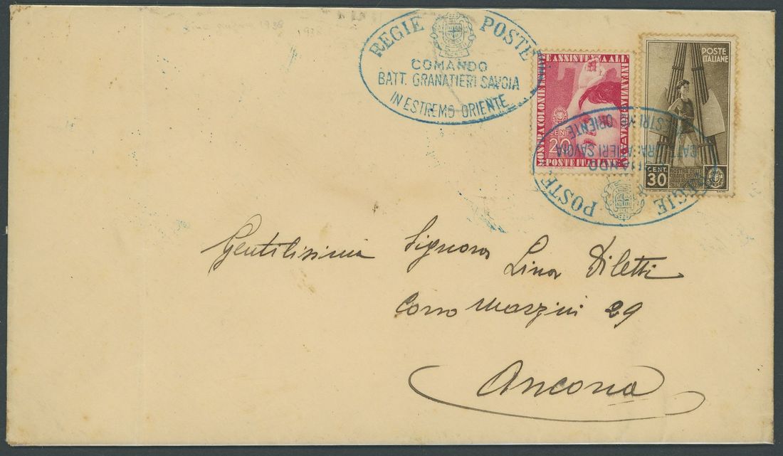 1938 (June) envelope addressed to Ancona with insignia of Savoia Italia Impero on flap, the address side with Italian Child Welfare 20c. carmine and 30c. brown, both tied by Arms in oval "
