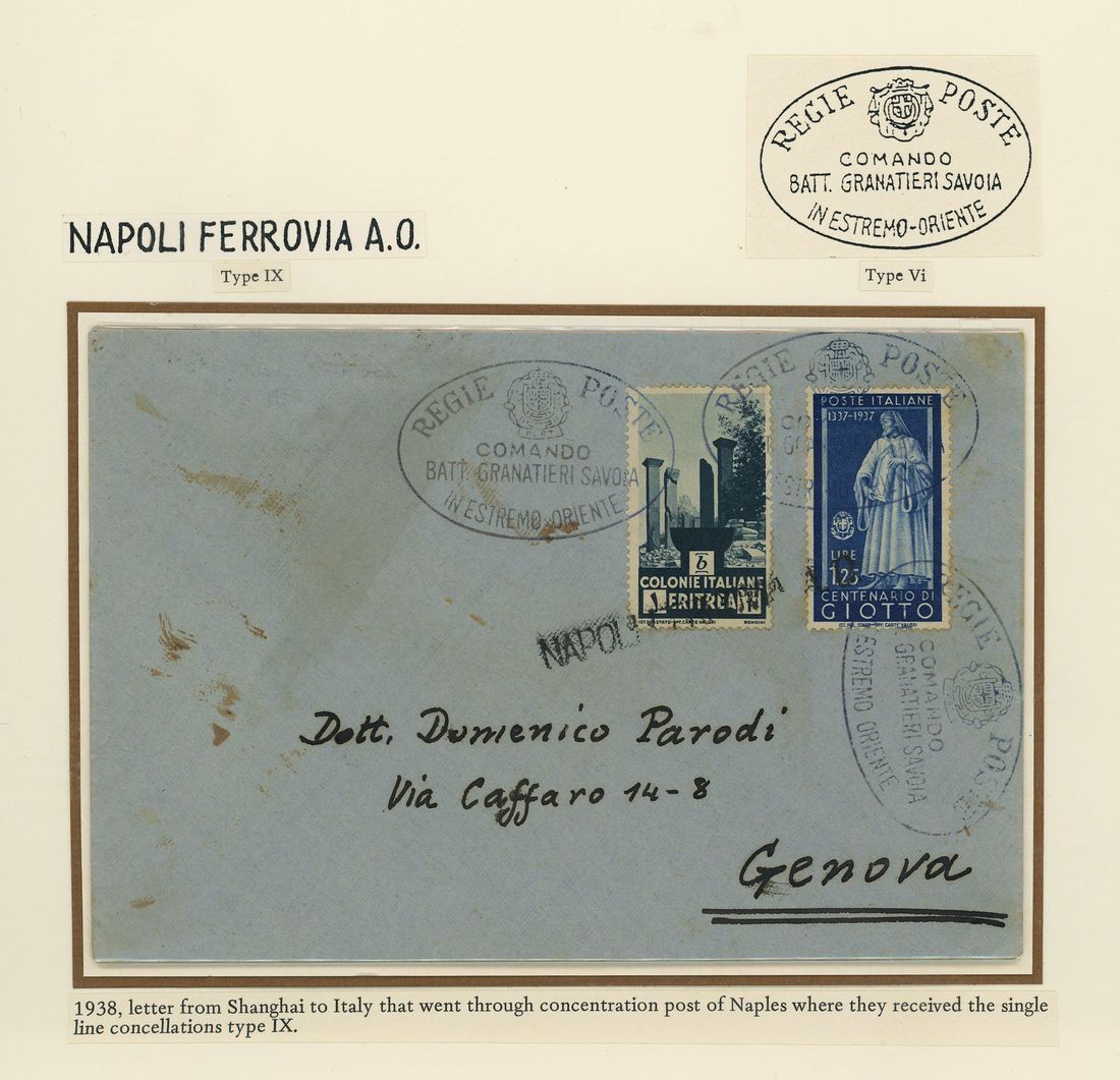1938 two envelopes addressed to Genoa and Ancona, the first with the adhesives cancelled by Arms in oval "