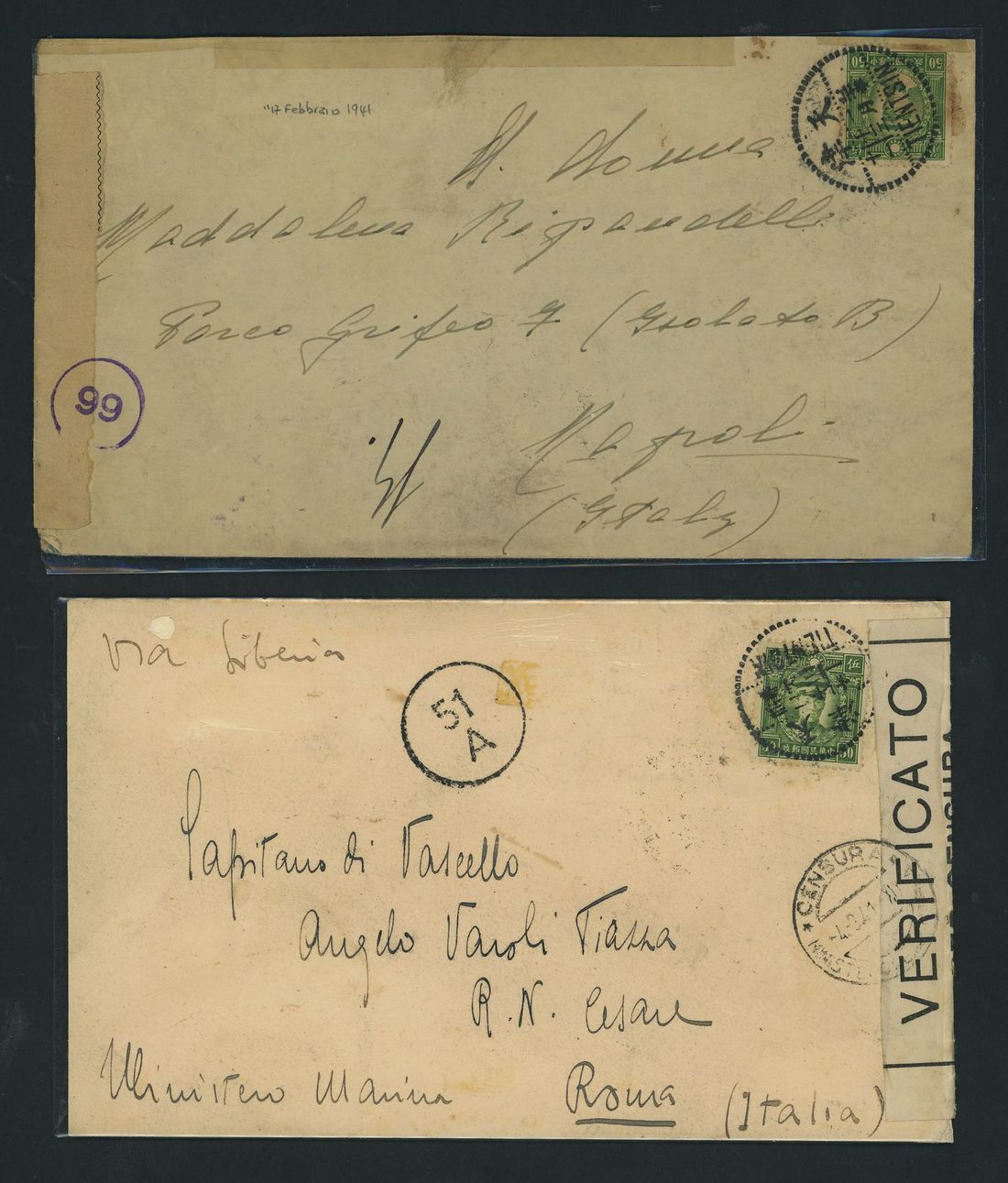 1941 (Feb.- Mar.) two envelopes from the Italian barracks in Tientsin (one with battalion logo on flap) addressed to Naples and Rome respectively, both covers bear Martyrs 50c. tied by Tientsin Chinese/English dotted c.d.s., with arrival postmarks and censor seals, the latter cover with numeral "3" censor handstamp and "