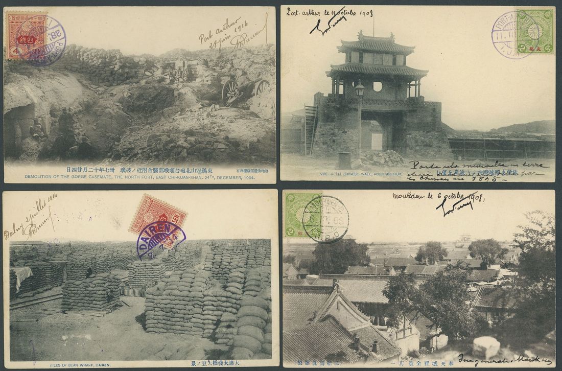 1905-14, a group of picture post cards to France, Tientsin or Swatow, franked with Japanese and "China" overprints on Japanese stamps and tied by I.J.P.O. c.d.s. of Shasi (2), Dairen, Port Arthur, Swatow, Tangku and Moukden; generally fine. (9 cards)