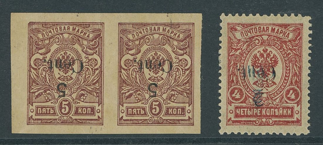 1920 5 Cents on imperforate 5k. brown, variety surcharge inverted in a horizontal pair, unmounted mint. S.G. 66a, Chan FR66A. Also perforated 2c. on 4k. red surcharge double, inverted, part original gum. Photo