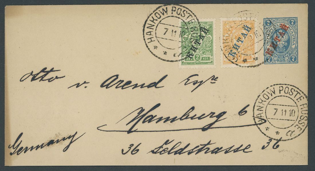 1910 (7 Nov.) Kitai 7k. stationery envelope to Germany, uprated with Kitai 1k. and 2k. cancelled by Hankow type 3a. c.d.s. with a further strike alongside. Without arrival postmark; some light paper ageing