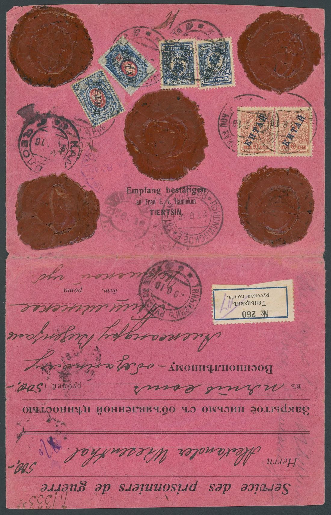 1916 (8 June) Prisoner of War printed envelope (pink) sent insured for 500r. bearing, on the reverse, Kitai 3k. (2), 10k. (2),14k. and 20k tied by Tientsin type 7 c.d.s., with Japan P.O. Tientsin and Changchun (faint) plus the arrival c.d.s. and five red wax seals; the address side with the blue on white insured label and further despatch c.d.s. Attractive. Photo
