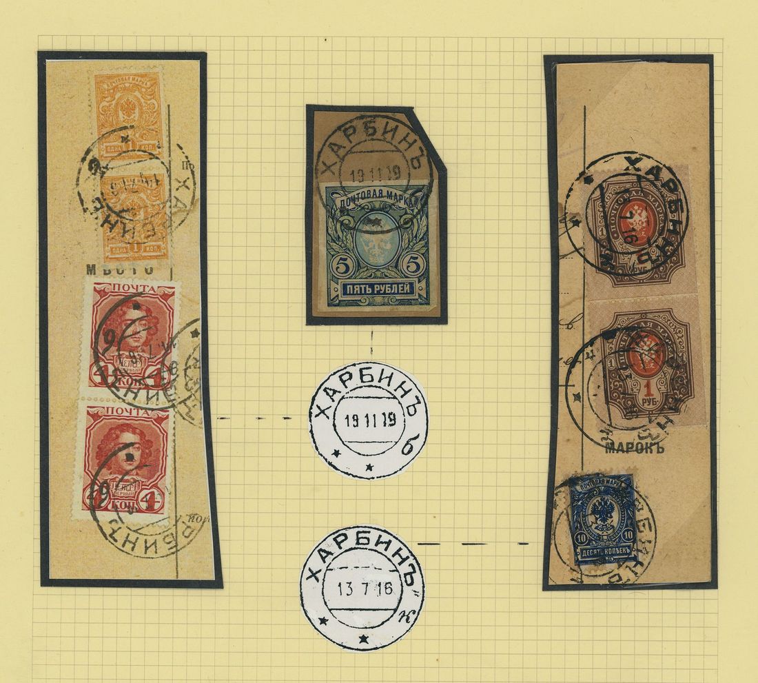 Harbin: A collection of postmarks which includes type 3 serial "a" in a large format, type 4 serial "a" showing two variations; type 4 serial "e", serial "v" on 10 dollars on 10r., serial "zh" on 10r. and 25c. on 25k. block of four, serial "d" on Romanov 7k., piece of Money Order bearing type 4 serial "k" and "b" in unusual types. Ex Raymond Casey