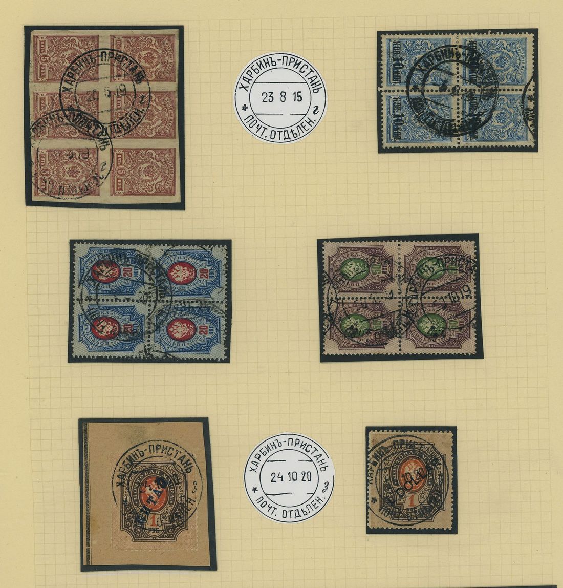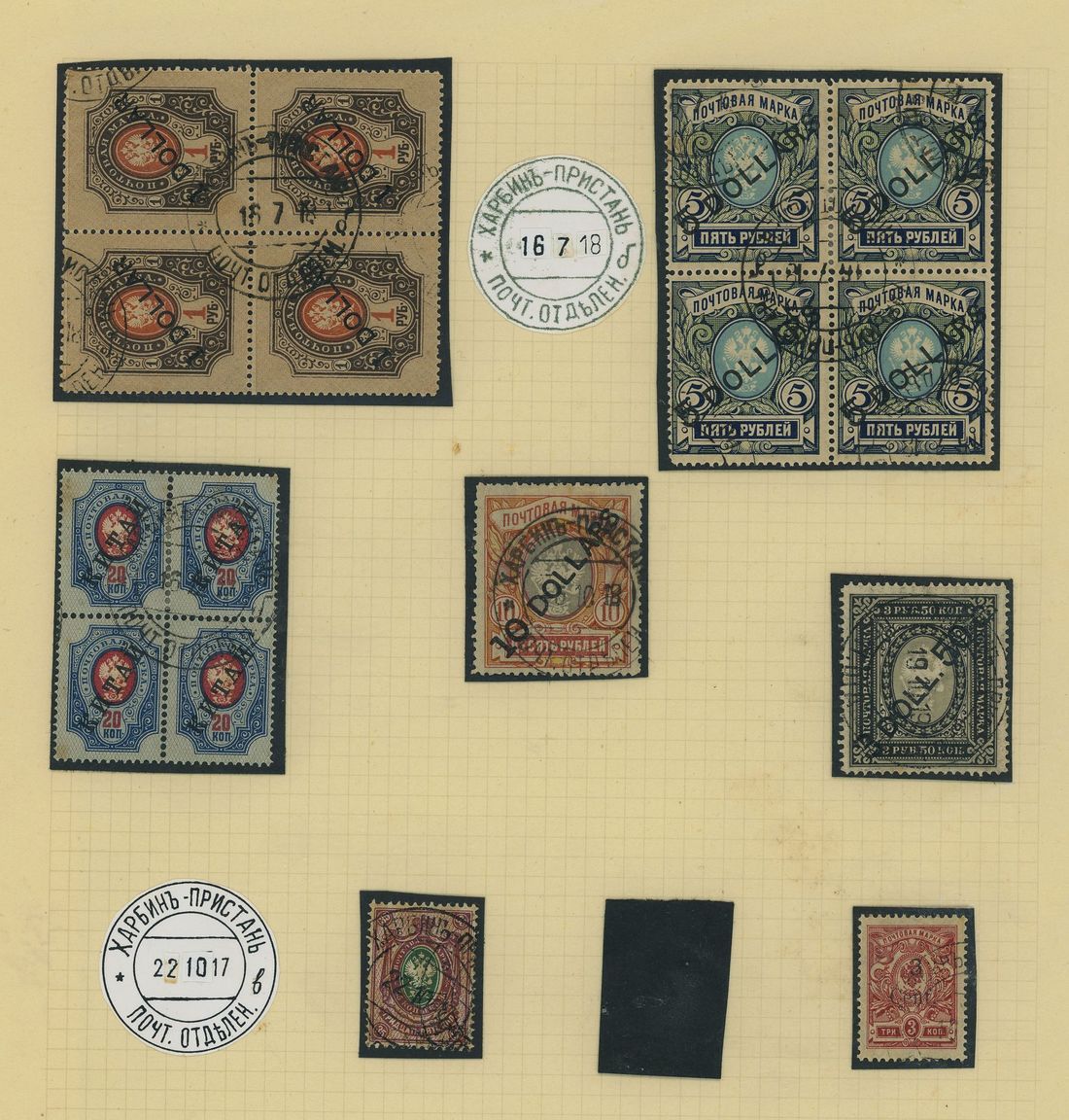 Harbin Pier: 1915-20, a group of singles and multiples on pages with type 2 serial "g" c.d.s. on multiples to 50k., serial "z" on Kitai 1r. and 1 dollar on 1r.; serial "b" on blocks of 1 dollar on 1r. and 5 dollar on 5r. plus other values to 10 dollar on 10r. plus a few others. Ex Raymond Casey (36)