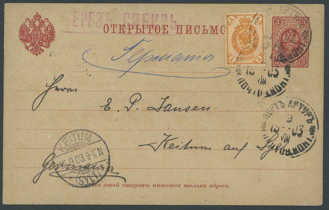 Port Arthur: 1903 (21 Aug.) Russia 3k. stationery card to Germany, uprated with Russian Arms 1k. cancelled by Port Arthur type 2 c.d.s with serial "4", a further strike alongside and Keitum arrival (15.9) in lower corner; scarce on Russian stamps. Photo