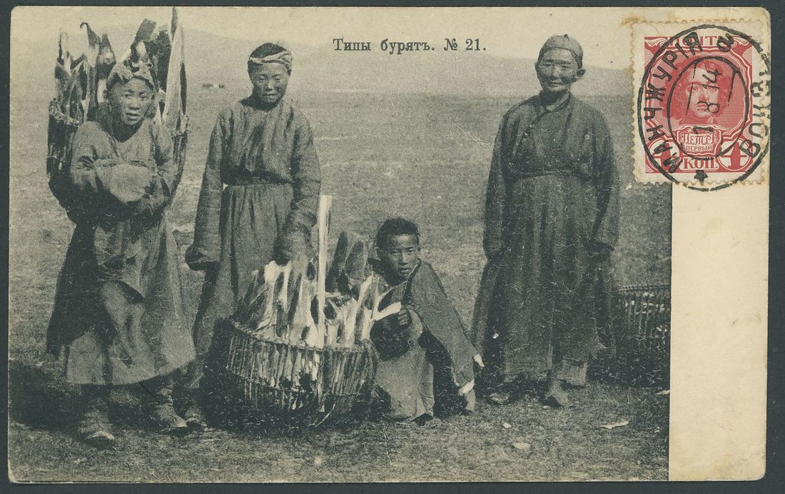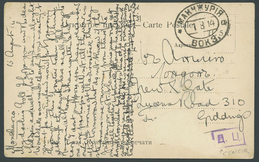 China Eastern Railway: 1914 (1 Aug.) picture post card of local boys to England bearing, on the picture side, Romanov 4k. tied by a superb strike of Manchuli Railway station dated oval, there is a similar strike on the address side with small censor handstamp; part of the address has been lost. Photo