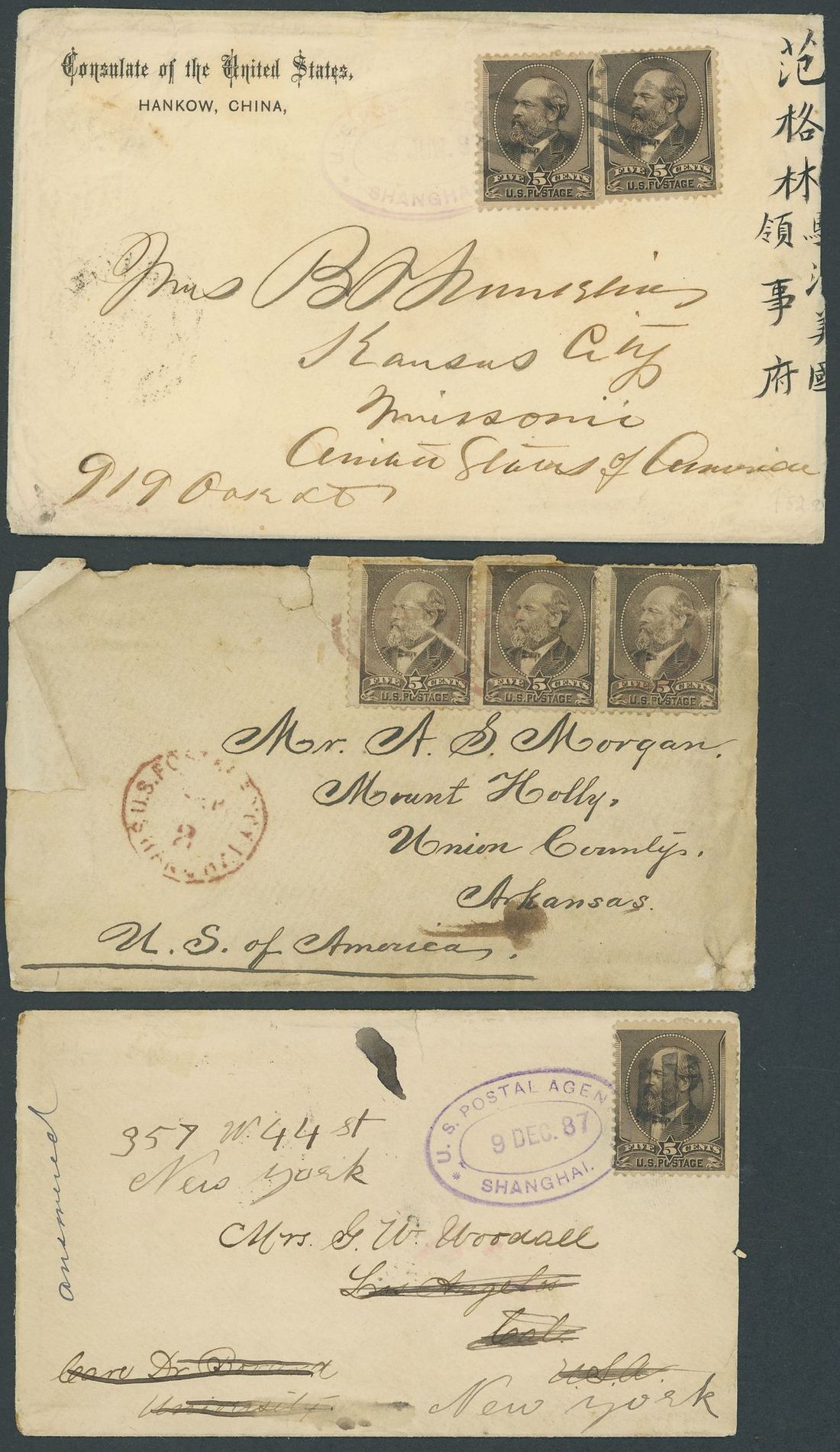 1882-87 (c.) a group of covers to U.S.A. bearing 1882 5c. grey-brown with 1882 (c.) (2 Sept.) envelope to Arkansas bearing 15c. franking tied by indistinct cancellations and showing a fair strike of type II "