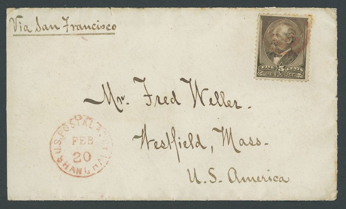 1886 (c.) (20 Feb.) opened-out envelope to Westfield, Mass. "via San Francisco" bearing Garfield 5c. brown cancelled with cork postmark in red and showing type II "
