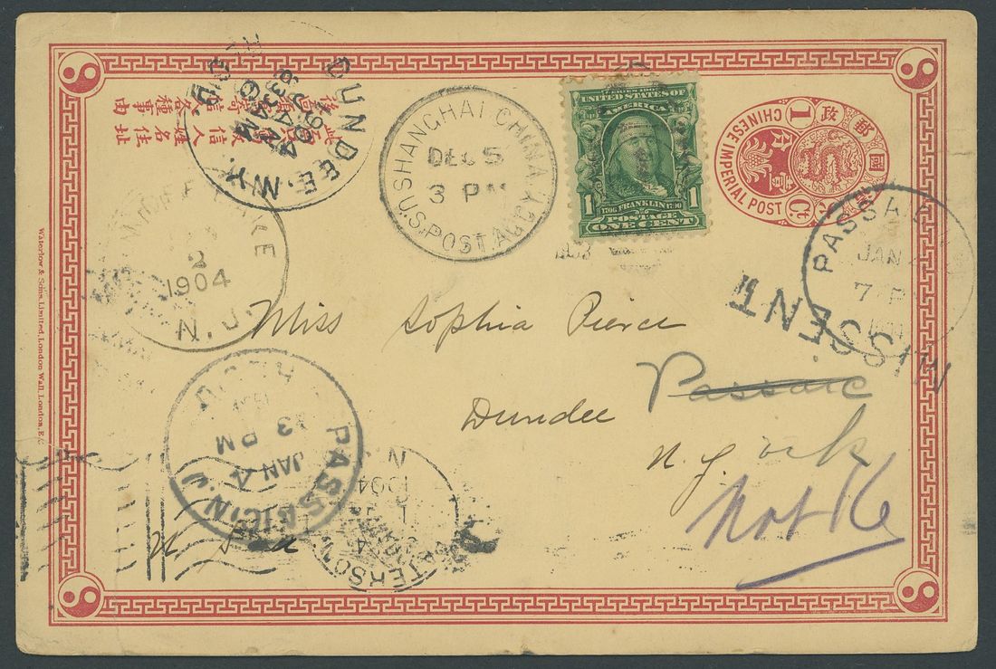 1903 (5 Dec.) China 1c. stationery card to Dundee, New York, bearing 1902-08 1c. blue-green tied by a good strike of type V "