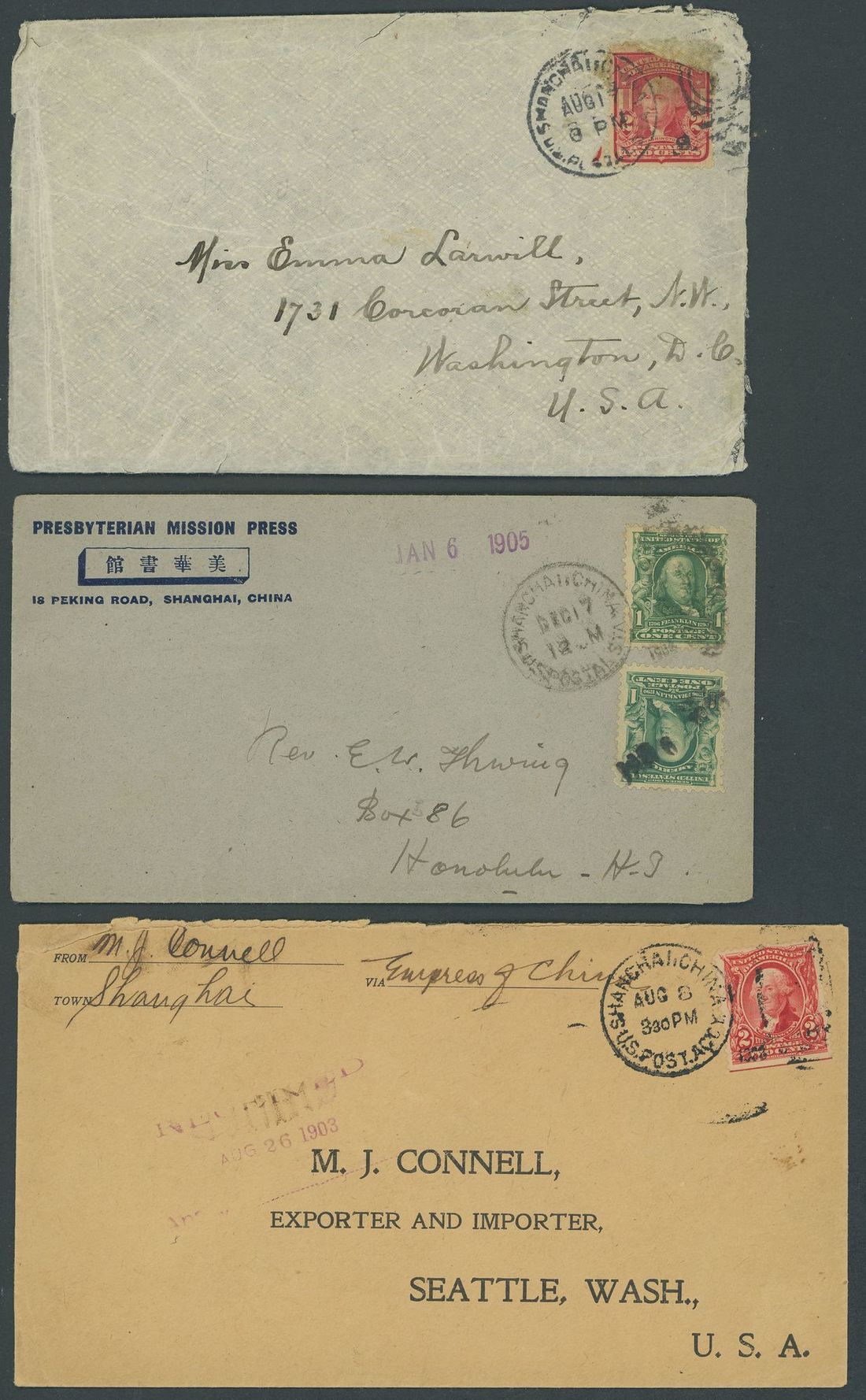 1903-08 a group of covers to U.S.A. with 1903 (8 Aug.) printed envelope to Seattle via "Empress of China" bearing 1903-08 2c. tied by type IV duplex; 1904 (17 Dec.) envelope from the Presbyterian Mission Press (with enclosure) to Honolulu bearing 1902-08 1c. (2) tied by type VIa duplex; 1909 (17 Aug.) envelope (with long typewritten enclosure) to Washington bearing 1903-08 2c. (defective) tied by type VI duplex with single figure yeardate. (3 covers)