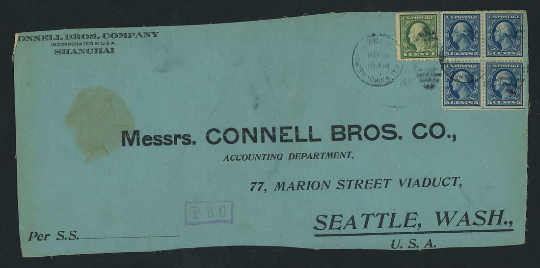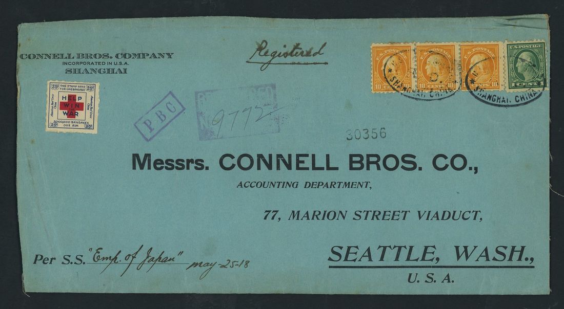 1909-18 a group of large printed Connell envelopes (3) and fronts (3) to Seattle which includes 1909 envelope registered bearing 1903-08 Washington 2c. scarlet (9) tied by the type III registered oval with large "R.D." in oval struck in purple and the later type of four-line registration datestamp (some lower case letters) also in purple; 1918 envelope registered bearing Washington 1c. green and Franklin 10c. yellow (3) tied by strikes of the type III registered oval with "R.D." in centre struck in black, with the manuscript number in registered handstamp in purple with 12c. Red Cross charity label and boxed "P.B.C." handstamp; 1918 opened-our cover bearing Washington 3c. purple (2) with Franklin 10c. yellow (3) tied by type XII duplex; the fronts with 1904 (?) bearing Washington 2c. (2) tied by a good strike of the type VIa duplex, underpaid with 4c. tax handstamp and Postage Dues applied, 1909 bearing 1903-08 4c. orange-brown tied by a fine strike of the type VI duplex, 1918 bearing Washington 1c. green and 5c. blue block of four tied by type XII duplex. Condition is a little mixed; a good selection. (6 items)