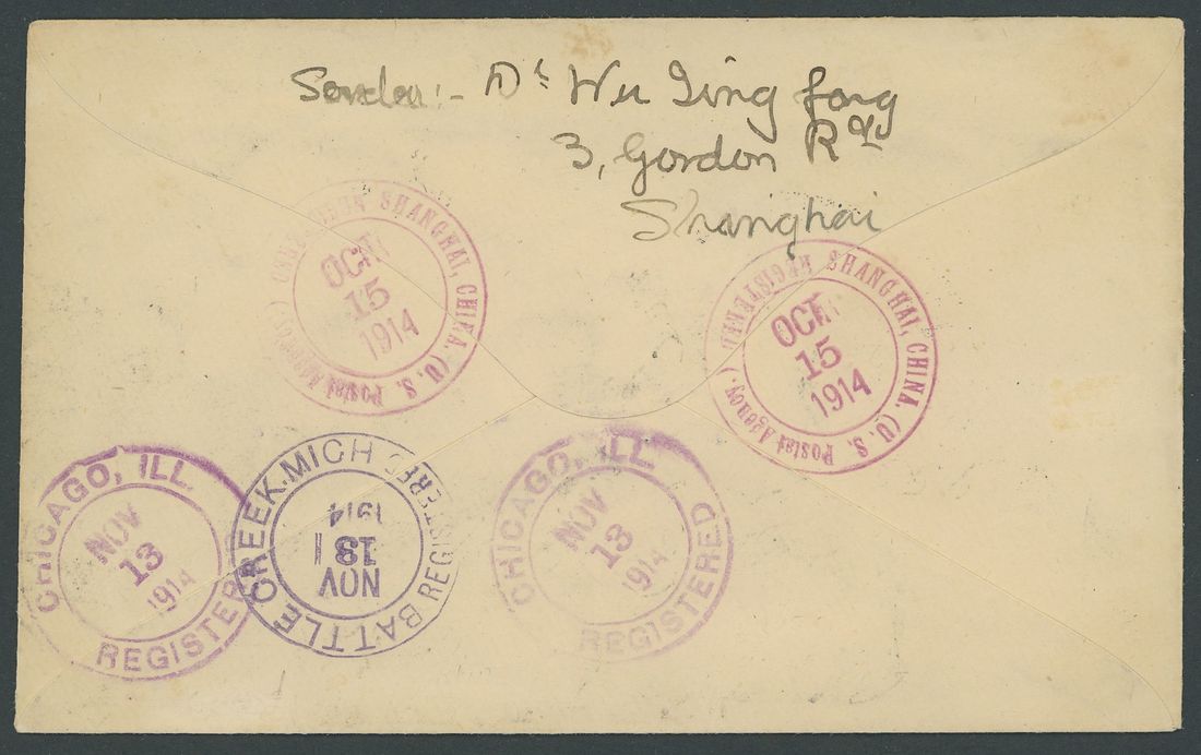 1914 (15 Oct.) envelope registered to Michigan bearing Washington 2c. rose (6) tied by two fair strikes of type III registered oval with "R.D." in centre with manuscript registration handstamp at left, the reverse bearing two good strikes of the type V registered c.d.s., Chicago (13.11) and Battle Creek (18.11) c.d.s. A good cover