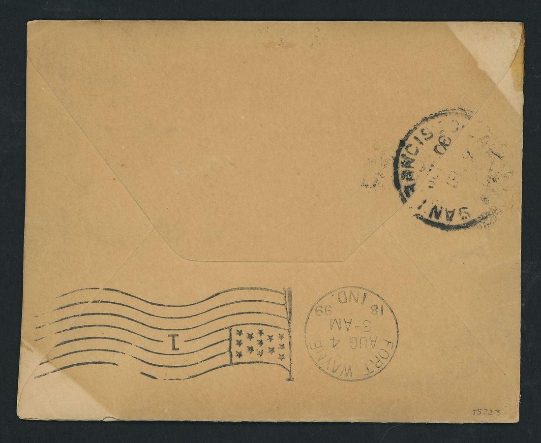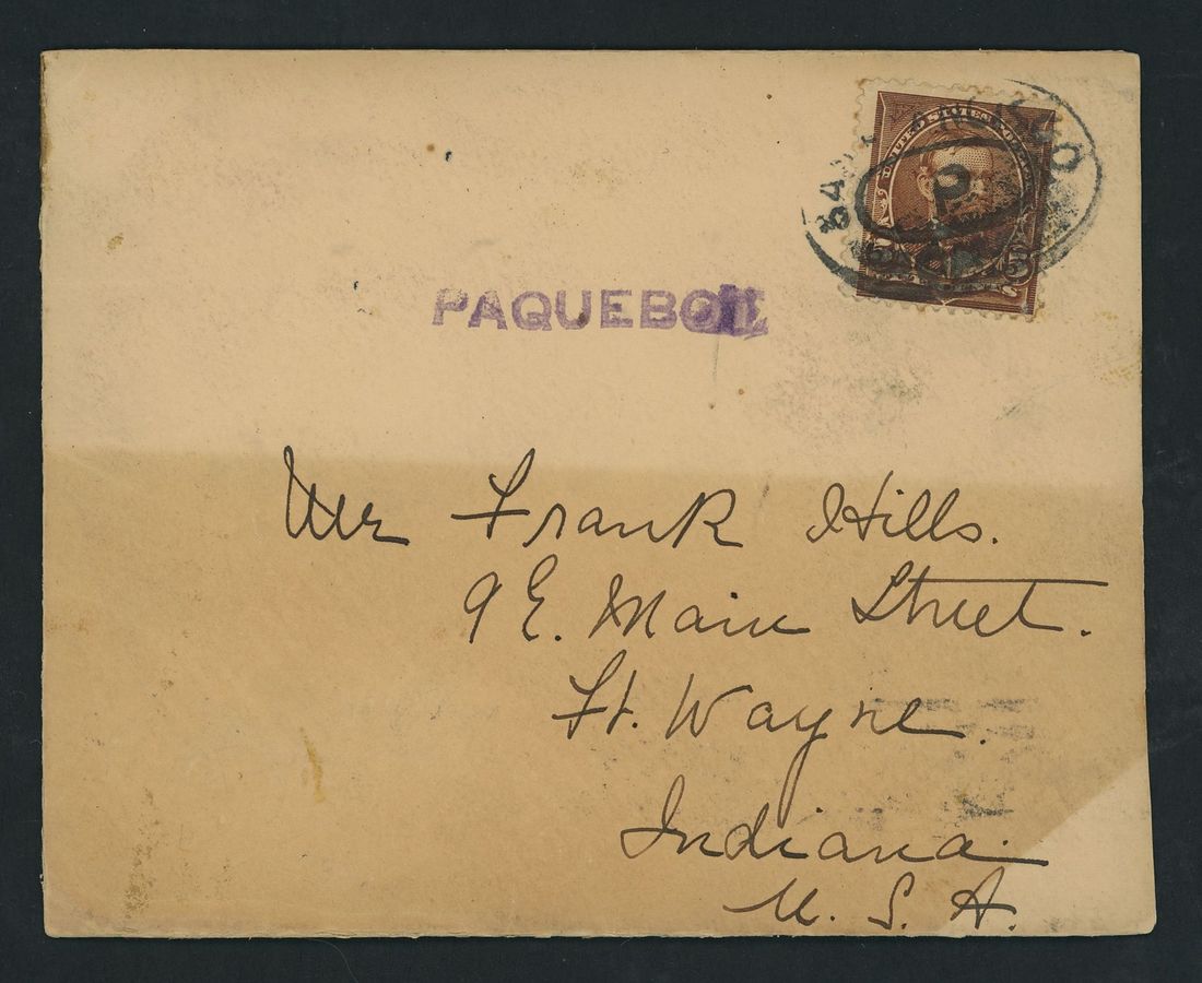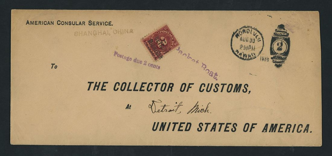 1888 (?) long stampless envelope from the American Consular Service, Shanghai, China to the Collector of Customs in Detroit Bearing Honolulu, Hawaii duplex (30.8), unframed "Packet Boat" in purple, precancelled 2c. Postage Due and handstruck "Postage due 2 cents" struck in purple; with the Consular red wax seal on the reverse. 1899 (22 June) envelope with original enclosure to Fort Wayne, Indiana bearing 1894-95 5c. tied by San Francisco double oval with central "P", straight-line "