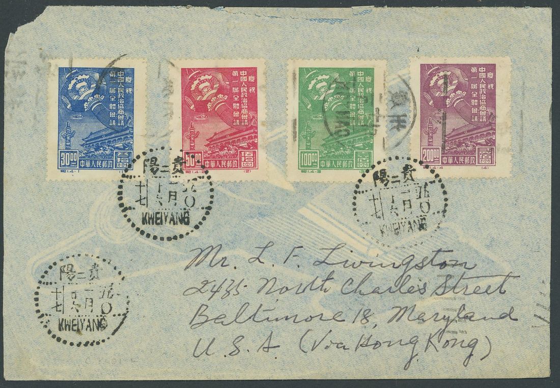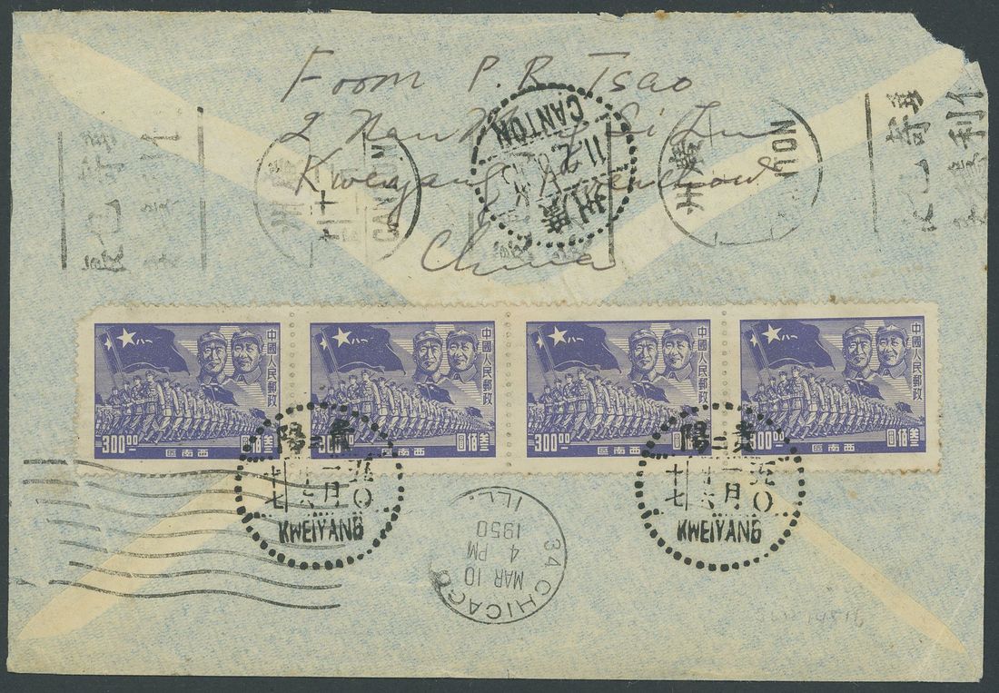 1950 (16 Jan.) envelope to Baltimore, U.S.A. "Via Hong Kong" bearing People's Republic (C1) set of four and, on the reverse, 1949 Marching troops $300 violet-blue strip of four tied by Chinese/English dotted c.d.s. with Canton machine postmark and Chicago (10.3) postmarks; the envelope is a little ragged. Photo