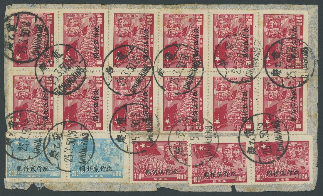 1950 (25 Mar.) envelope sent air mail to England bearing, mostly on reverse, 1949-50 $1500 on $100 dull brown, $500 on $100 carmine (15) and $2000 on $200 light blue (4) cancelled by Chungking Chinese/English c.d.s. with Canton (11.4) transit; manuscript endorsement indicates that it arrived in London on 25 April; some edge wear. Pays $17,000 rate. Yang SW20, 32, 36. Photo