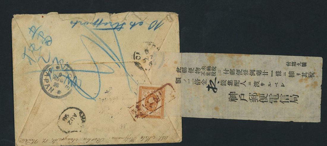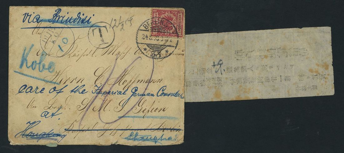 1888 (24 June) envelope to S.M.S. Gefion c/o Berlin bearing Eagle 10pf. carmine tied by Berlin c.d.s., redirected to Hong Kong "via Brindisi", thence Shanghai and finally Kobe, with large figures "10" in purple crayon, large "T" in circle and circular "