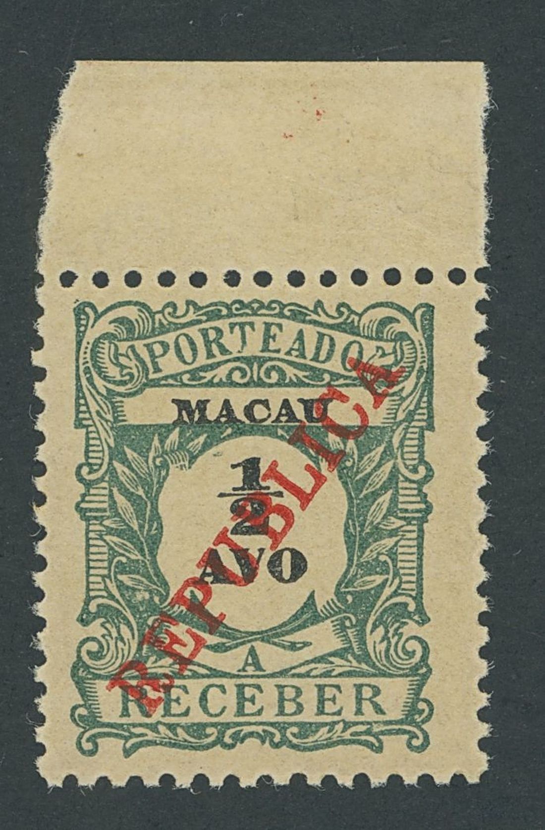 1914 Postage Due, Local Overprint, ½a. blue-green, with top margin, lightly mounted in the margin only. A fine example of this scarce stamp. Yang D23; S.G. D281, £2250. Photo