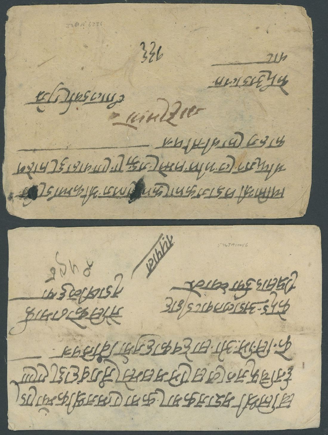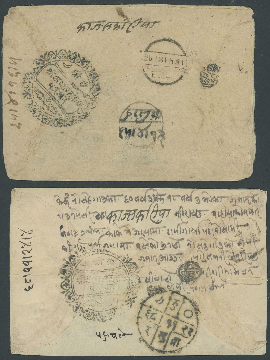 Kerong Court: two stampless covers to Katmandu bearing, on the reverse, the large fancy seal of the court, the first with Rasuwa datestamp and Trisuli transit; the second with Trisuli Sun and Moon transit; both with personal seals in black. (2 covers)