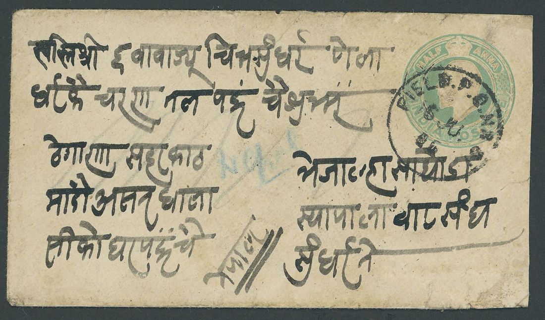 Field Post Office No.81: 1906 (6 June) India K.E.VII ½a. stationery envelope to Nepal cancelled by a good strike of Field Post Office No.81 type B1 c.d.s., the reverse bearing Base Office (19.6) and Nepal arrival c.d.s. (22.6); some edge wear. Photo