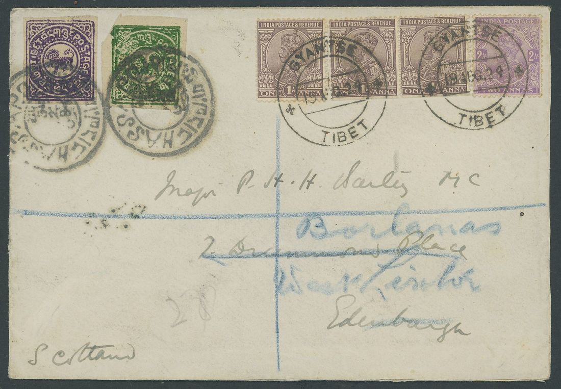 1924 (Aug.) envelope registered to Major Bailey in Edinburgh bearing 1912 1/6 tr. olive-green (shiny ink) with ½tr. deep violet tied by Lhassa postmark and used in combination with India K.G.V 5a. franking tied by Gyantse, Tibet c.d.s. (19.9), the reverse bearing Gyantse registration label and Edinburgh arrival c.d.s. (14.9); good to fine. Photo