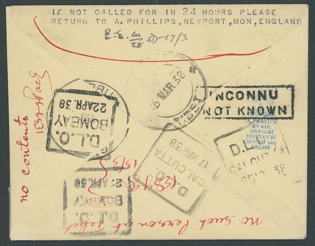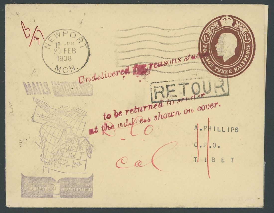 Incoming Mail: 1938 (20 Feb.) G.B. K.G.V 1½d. stationery envelope cancelled by Newport Monmouthshire machine postmark, addressed to A. Phillips, G.P.O., Tibet; there is an air mail cachet, boxed "