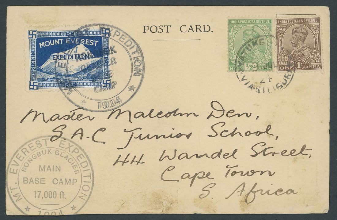 The Second Expedition: Rongbuck Glacier, 17,000 ft.: 1924 (9 July) souvenir picture postcard to Cape Town, South Africa, bearing India K.G.V ½a. and 1a. tied by "