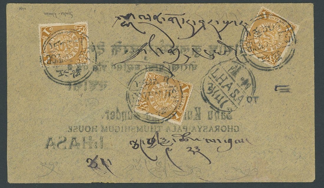 1910 (c.) printed Sundar envelope to Lhasa bearing, on the reverse, C.I.P. 1c. (3, one with perf. faults) tied by Gyantse type 1 postmark with similar for Lhasa alongside, there is a further despatch postmark on the address side. Fine. Photo