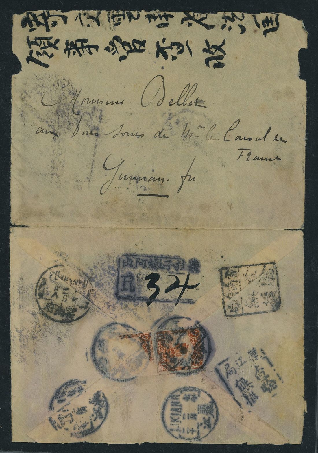 1918 (12 Feb.) opened-out envelope to the French Consul in Yunnanfu bearing, on the reverse, Junk 8c. (2, one largely missing) tied by Atuntse c.d.s. with a very fine strike of the boxed registered handstamp numbered "34", Likiang (20.2) and Yunnanfu (28.2) arrival c.d.s. and showing Likiang and Yunnanfu boxed "inspected, no damage" handstamps. A rare cover and probably the earliest extant registered cover from Atuntse. Photo