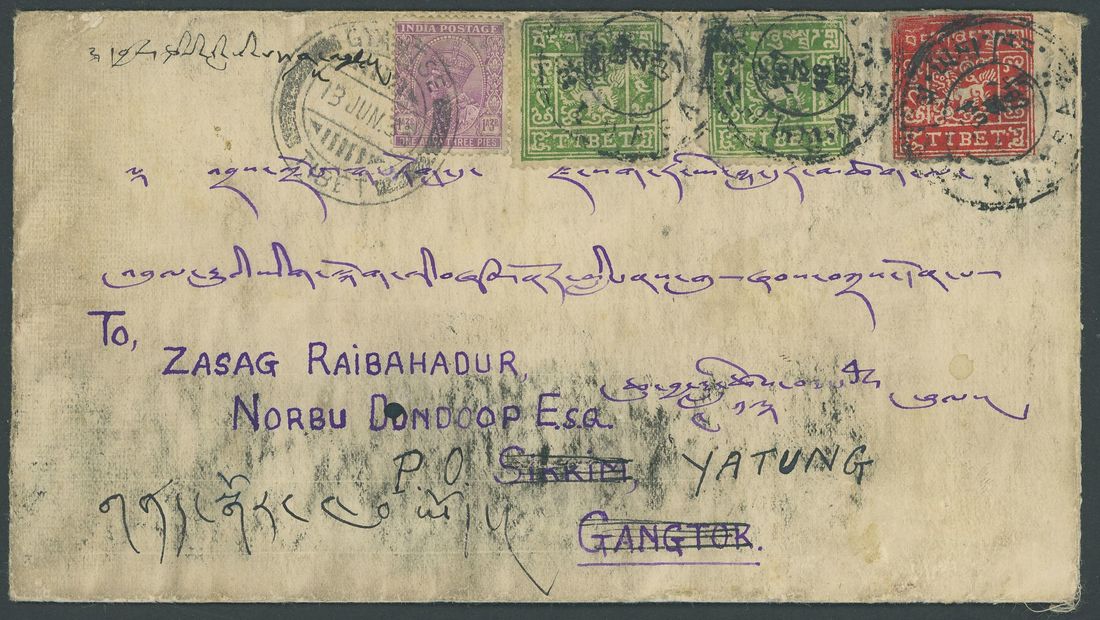 1933 (June) linen envelope registered to Gangtok and redirected to Yatung, bearing perforated 2tr. scarlet and 4tr. emerald (2) tied by Lhasa postmark, with India K.G.V 1a.3p. tied by Gyantse c.d.s. (13.6), the reverse bearing two black wax seals and Yatung, Tibet/via Siliguri (15.6) c.d.s.; some light soiling. An impressive franking. Photo
