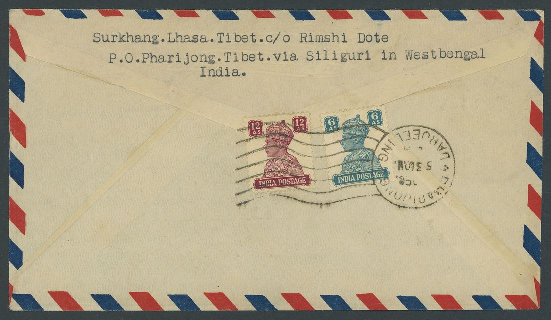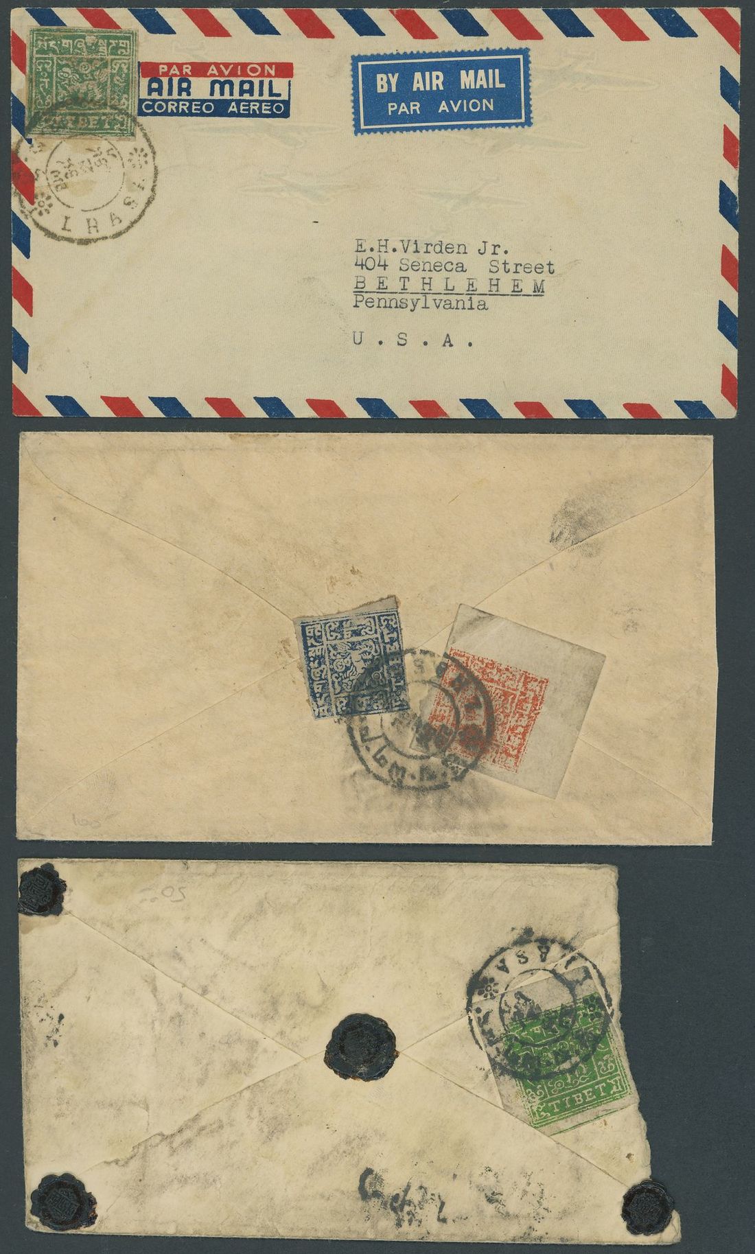 1942-47 (c.) a small group of third issue covers with a local cover bearing 2tr. orange-brown and 2/3 tr. tied by Lhasa postmark, paying the short-lived 2 2/3tr. rate; local registered envelope bearing 4tr. deep emerald paying the 3tr. rate plus registration; air mail envelope to U.S.A. bearing 4tr. sage-green and, on the reverse, India 18a. franking tied by Darjeeling postmark. Condition is variable. (3 covers)