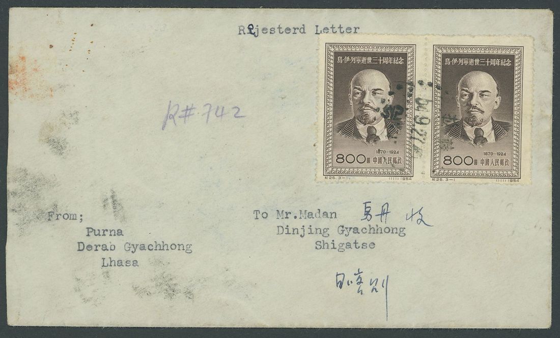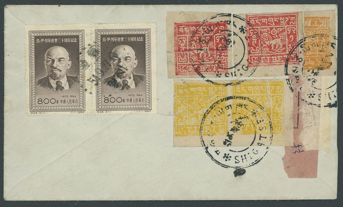 1954 (27 Sept.) envelope registered to Shigatse bearing Lenin $800 (4) cancelled by Lhasa dotted c.d.s. and with 1933 ½tr. lemon (2), 1tr. scarlet-red (2) and 2tr. bright orange bisected vertically tied by Shigatse c.d.s.; an interesting combination paying the 4tr. rate (apparently not including the registration). Photo