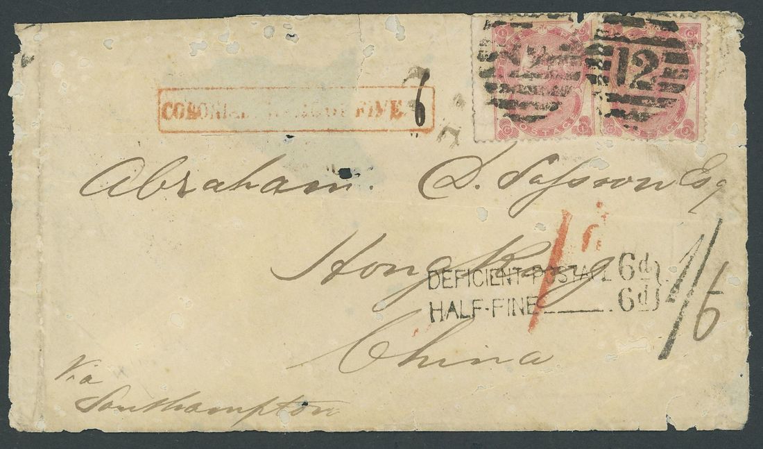 1863 (19 June) envelope to Hong Kong "Via Southampton" (soiled and worm holes) bearing G.B. 1862-64 3d. rose (2, some damage) cancelled by London "12" barred ovals, with a fine strikes of unframed "