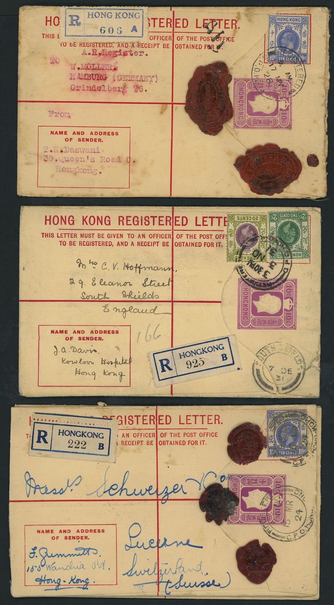 1914-32, a selection of used 10c. envelopes with sizes G (6), size H (5) and size K, mostly addressed overseas with various registration labels and handstamps and includes Insured which is tied with string, with Sheng Wan c.d.s. and "