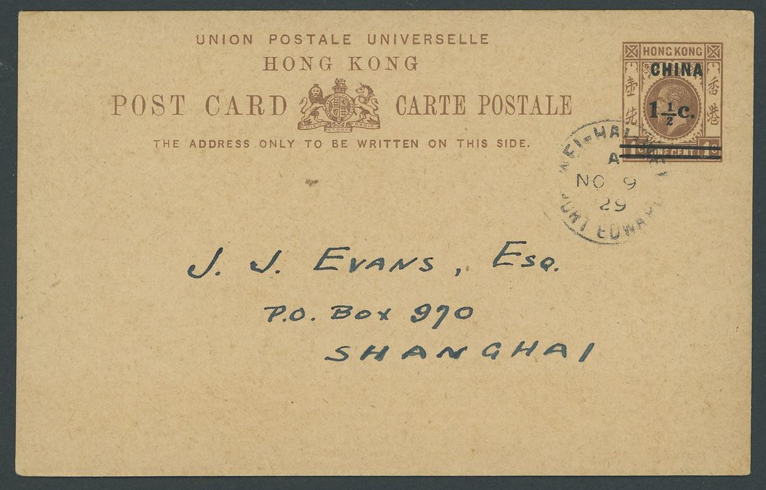 Post Cards: 1929 (9 Nov.) 1½c. on 1c. to Shanghai cancelled by "