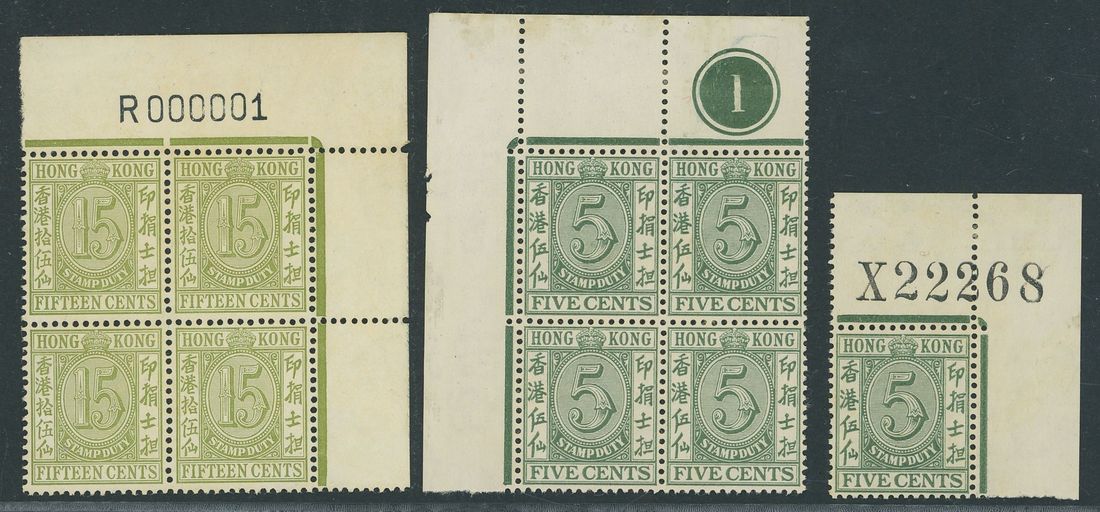 1938 5c. green in a top left corner block of four and a top right corner single with requisition "X22268", part to large part original gum; also 1921 15c. pale green in a top right corner block of four with requisition "R000001", unmounted mint, some minor gum ageing. (9)