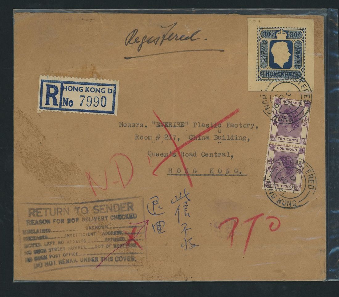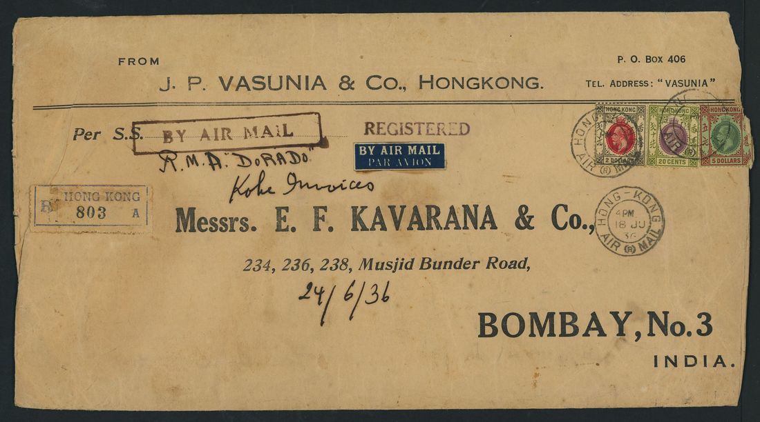 1936-61 two covers with 1936 (18 June) large printed envelope registered air mail to Bombay bearing K.G.V 20c., $2 and $5 (damaged on opening) tied by Hong Kong Air Mail c.d.s. with registration label, boxed "