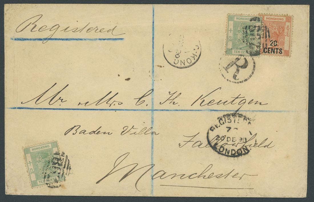 Arnhold Karberg & Co.: 1890 (20 Nov.) envelope registered to Manchester bearing 10c. green (2, one for late fee) and 20c. on 30c. orange-red each with "AK/&Co" perfin tied by "B62" and large "R" in circle, with the despatch c.d.s. alongside and London Registered oval (20.12) at foot, the reverse bearing Manchester arrival (21.12) c.d.s.; some soiling