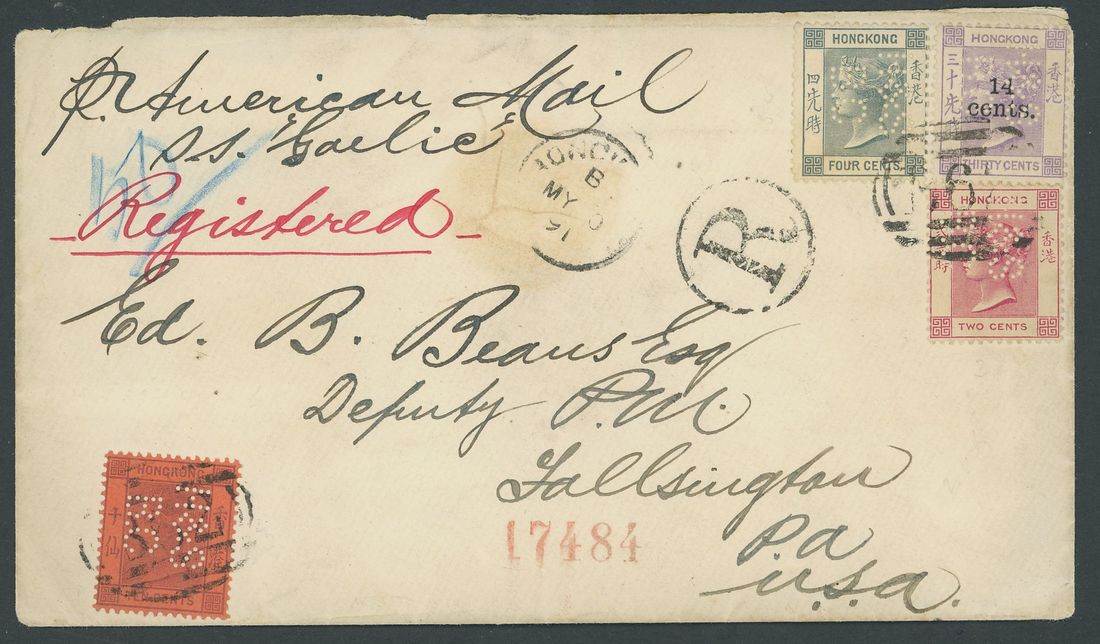 Hongkong & Shanghai Bank: 1891 (10 May) envelope registered to U.S.A. "Pr American Mail ss 'Gaelic'" bearing 2c. carmine, 4c. grey, 14c. on 30c. and 10c. purple on red paying the late fee, each with "H&S/BC" perfin cancelled by large "B62" type D6 with large "R" in circle and the despatch c.d.s. alongside, the reverse bearing San Francisco transit (23.6)