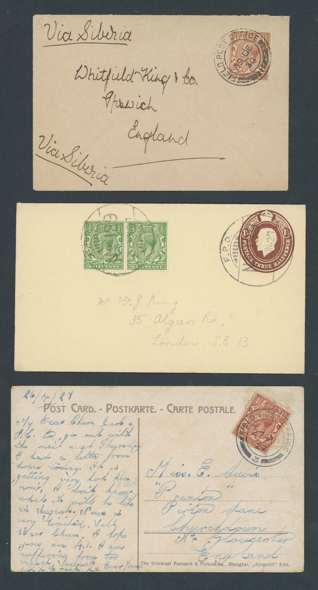 1927-30 a group of covers to England with 1927 picture post card bearing K.G.V 1½d. tied by F.P.O./3 c.d.s.; 1½d. stationery envelope uprated K.G.V ½d. pair cancelled by good strikes of large "