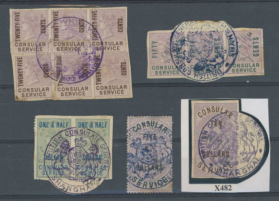 A selection of stamps on dealer's pages which includes a few better postmarks including pa-kua on Hong Kong (4), part large "R" in circle, some Branch Offices, paquebot and others; also a selection of Consular Service stamps (13) with values to $10 and 1938 (21 Jan.) 5c. postal fiscal envelope used the day following the official period of use