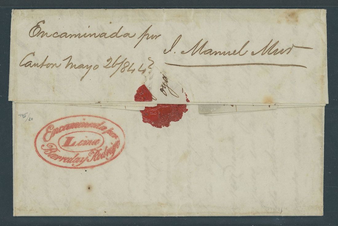 1844 (29 Apr.) entire letter to Lima, Peru via Chile, the reverse bearing manuscript "Encaminada per Canton Mayo" and a superb strike of double oval "Encaminada per/Barreday Rodrigo/Lima" struck in red; the address side bearing a light strike of unframed "
