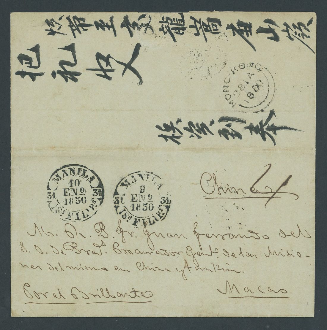 1859 (9 Jan.) stampless entire letter to Macao bearing two fine despatch c.d.s. (one 10.1) and manuscript "4", the reverse with Hong Kong transit c.d.s. (28.1) and numerous ink stroke delivery characters. An attractive cover. Photo