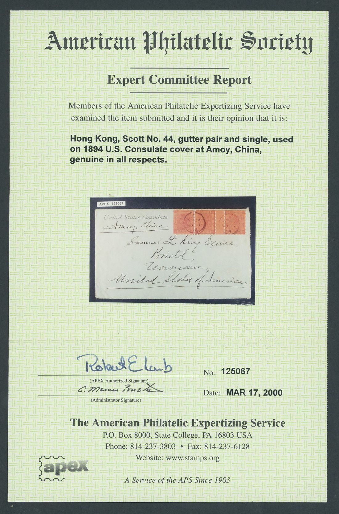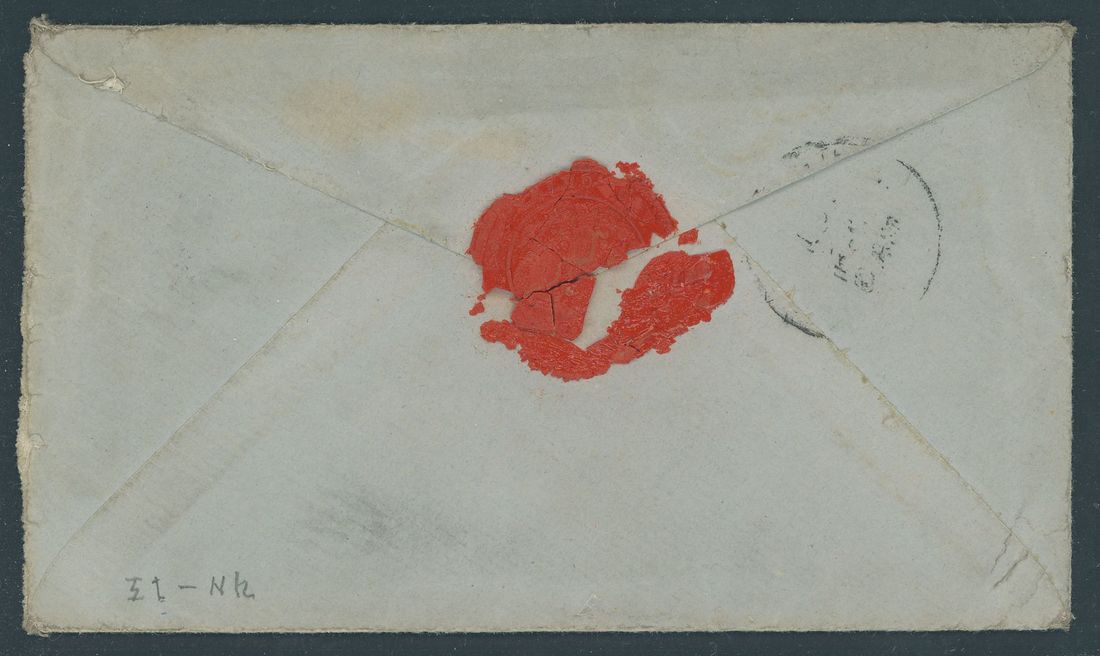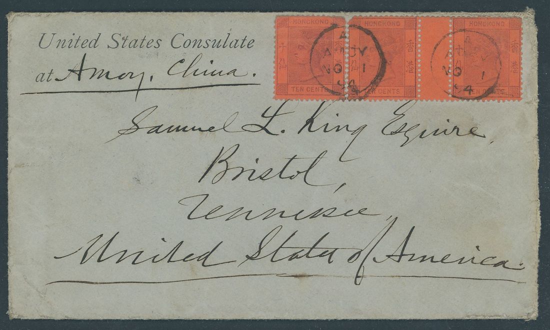 1894 (1 Nov.) envelope from the United States Consulate at Amoy to U.S.A. bearing Hong Kong 10c. purple on red interpanneau pair and single tied by straight-line Amoy code "A" c.d.s., the reverse bearing indistinct arrival c.d.s. and part red wax Consulate seal. Photo