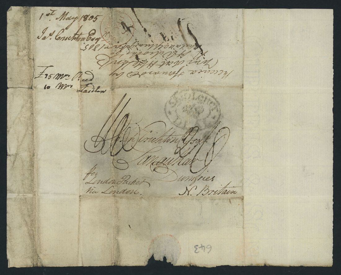 1805 (1 May) an entire letter to Dumfries, Scotland marked "for London Packet via London", the reverse bearing manuscript, "Received & forwarded by your obedt. Hble Servts R H Wilcocks & Co Philadelphia 9 Novr 1805" with a slightly smudged strike of double-oval "Ship Letter/crown/ DEAL" in black with "1/10" and "2/8" rate marks plus London arrival c.d.s. (8.12) on the reverse. With the original enclosure which was addressed "P. American Ship Hera". A rare early routing to U.K. via America; possibly the earliest. Photo